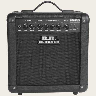 BBG15FX - 2-канальный гитарный комбо мощностью 15 Ватт. Динамик 6,5 дюймов, импенданс 8 Ом. Секция EQ: Bass, Middle, Treble, эффекты делей и ревербератор, входы Aux/CD/MP3-плейер/наушники. Размеры: 302 Х 300 Х 190 мм, вес 5,5 кг.