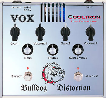 - Регуляторы и переключатели эффекта Bulldog Distortion - регулятор уровня перегрузки 1-ого канала (Gain 1), регулятор уровня громкости 1-ого канала (Volume 1), регулятор уровня перегрузки 2-ого канала (Gain 2), регулятор уровня громкости 2-ого канала (Volume 2), регулятор уровня низких частот (Bass), регулятор уровня высоких частот (Treble), регулятор тембра уровня (Gain 2 Voice), переключатель канала перегрузки (Gain1/Gain2), педаль включения эффекта (Effect)