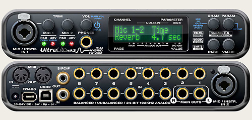 UltraLite-mk3 Hybrid обеспечивает профессиональное качество аудио до 192 kHz а так же множество входов/выходов, включая два микрофонных/инструментальных входа, 6 линейных аналоговых входов, 10 каналов аналоговых выходов, стерео S/PDIF и отдельный выход на наушники.