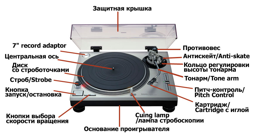 Диск - это плоский круг, на который устанавливается пластинка, а шпиндель (центральная ось) - это металлический наконечник в центре диска, на который насаживается пластинка. Шпиндель можно использовать для настройки скорости - наверное, вы видели, как диджеи удерживают и вращают его. Строботочки - это отметки сбоку на диске, которые используются для определения правильной калибровки вертушки. Когда диск вращается со скоростью точно 33 или 45 оборотов в минуту, благодаря стробоскопическому эффекту будет казаться, что точки стоят неподвижно.