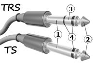 TS phone 1/4"(TS четвертьдюймовый Джек) – самый распространенный разъём для передачи аудиосигнала, его можно встретить на несимметричных соединительных кабелях, инструментальных и speaker-кабелях. Аббревиатура «TS» расшифровывается как: T – Tip, что означает «кончик» и S – Sleeve, что можно перевести как «гильза». Именно из этих двух частей состоит этот разъём. При использовании двухконтактного разъёма контакт Tip (2) соединяется с сигнальным проводником, а контакт Sleeve (1) – с общим или земляным проводником, например, экранирующей оплеткой. 4 — изоляция.