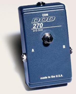 Самым простым коммутатором является так называемый A-B Box. Он позволяет направить сигнал с входа на один из двух выходов, или один из двух источников сигнала подключить к одному приемнику. Например, A-B Box DOD 270 способен подавать на один выход сигнал с одного из двух источников или посылать входной сигнал на один из двух приемников. Все три разъема (A, B, Com) для подключения источников и приемников - джеки. Переключение осуществляется нажатием на кнопку-педаль.