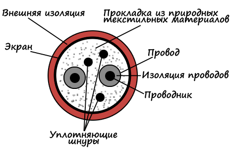 При всем многообразии типов кабелей все они имеют сходные конструкции. Если рассмотреть поперечное сечение кабеля, то в его центре находятся один или несколько проводов, покрытых слоем изоляции. Эти провода, вместе с прокладкой из природных текстильных материалов, служащей для упрочнения конструкции и снижения микрофонного эффекта, помещены в зкранирующую оплетку. Все это покрывается одним или несколькими слоями изоляции.