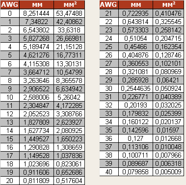 Кроме электрических характеристик, основными из которых являются сопротивление, индуктивность и емкость, у провода есть также важные физические характеристики – диаметр, площадь поперечного сечения или калибр. Диаметр провода измеряется в миллиметрах, площадь поперечного сечения – в квадратных миллиметрах, а для калибра существует американская система AWG (American Wire Gauge). Для сопоставления калибра AWG, диаметра и площади поперечного сечения круглого провода существует таблица.