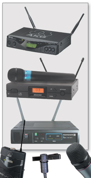 Идеальная система для лидирующих вокалистов включает в себя приемник и микрофон либо со встроенным передатчиком, либо с отдельным передатчиком, который подключается прямо к микрофону. В обоих этих случаях отсуствует кабель и нательный передатчик. Преимущество последнего варианта заключается в том, что вы можете использовать беспроводную систему с вашим любимым микрофоном, вместо того чтобы использовать тот микрофон, который идет в комплекте. Некоторые фирмы выпускают беспроводные системы, включающие в себя популярные модели микрофонов.