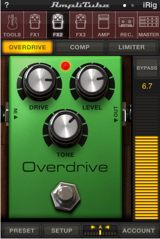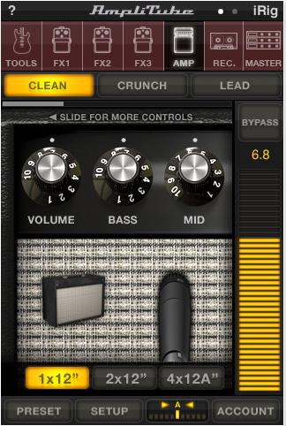 AmpliTube имеет интуитивно понятный интерфейс. Все эффекты просто вводить в режим bypass. Уровнем квакушки (или phaser), например, можно управлять простым касанием экрана, или вы можете переключиться в режим благодаря аскелерометру, когда управление осуществляется положением устройства в пространстве. Есть возможность сохранить до 12 пользовательских пресетов с любой комбинацией кабинетов, усилителей, примочек и их настроек.
