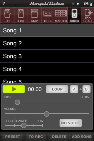 AmpliTube iPhone оснащен известной SpeedTrainer обущающей функцией, которая позволяет замедлять или ускорять темп аудио материала (до половины или вдвое от первоначальной скорости). Так же в приложении имеются цифровой хроматический тюнер и метроном, полезные для обучающихся и практикующих музыкантов.