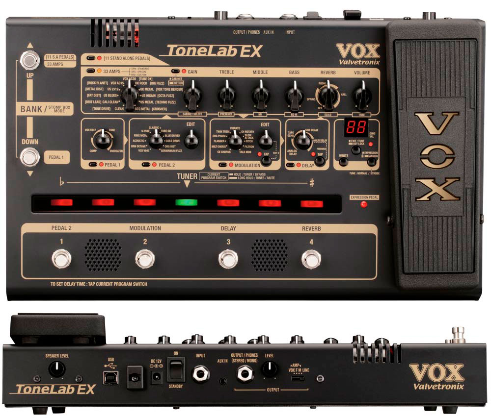 ToneLab EX также включает встроенный хроматический тюнер с ярким светодиодным дисплеем и режимами индикации Normal/Strobeс для удобного просмотра во время выступления, а также "Stomp-Box" режим, где отдельные эффекты можно включать и выключать с помощью педали управления.