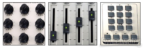 Ручки на DAW-контроллерах бывают 2 типов: не имеющие ограничений вариаторы и, собственно, ручки. Вариаторы могут работать с любыми функциями и удобны тем, что "запоминают" значение. Например, вы с помощью вариатора выставили значение панорамы на фонограмме. Когда через некоторое время вы вернетесь к этому треку, нужное значение будет уже выставлено и положение вариатора влиять на него не будет. Обычная же ручка имеет ограниченный диапазон вращения и значение, которое она передает в программу, зависит от ее положения. Если вы настроили панораму с помощью ручки, то, вернувшись к этому треку, заметите, что, хоть программа и запомнила это значение, положение ручки может ему не соответствовать.Контроллеры обычно снабжены фейдерами, ручками и кнопками, например, управляющими фонограммой (старт, стоп и поиск по фонограмме). Некоторые контроллеры оборудованы дополнительными функциями, например, эквалайзером.