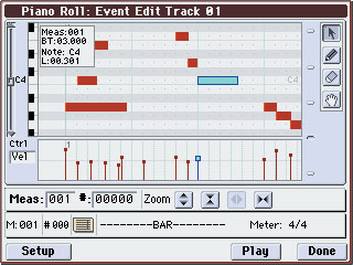 На этой странице представлен обзор всех событий каждого трека, таких как ноты, скорость нажатия и изменение СС-событий. Опять же, с помощью сенсорного дисплея вы можете перемещать, копировать и удалять такты или треки.