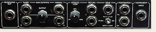 Заглянув на заднюю панель мы обнаружим множество всяких входов и выходов - например это выход на наушники (выход с эмуляцией кабинетов), плюс пару выходов на усилитель -это выходы на гитарный усилитель (выходы без эмуляции кабинетов) и выходы на обычный негитарный усилитель или микшер (выходы с эмуляцией кабинетов) - причем все это заточено под стерео режимы - все выходы идут "налево и направо". Также можно увидеть, что к преампу возможно подключить стерео процессор через Fx loop и обработать все эти дела эффектами. Петля, кстати параллельная и можно регулировать степень участия эффектов в конечном результате.
