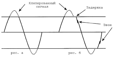 | Рассмотрим пример с синусоидальным сигналом. Как только RA-100 выходит из режима клипирования, он сразу же начинает отрабатывать входной сигнал (рис. а). Некоторые же усилители “зависают” на уровне клипирования дольше, чем это необходимо на самом деле и привязываются ко входному сигналу с задержкой (рис. б). В ряде случаев такая рассинхронизация может привести к более существенным искажениям звука, нежели собственно клипирование. | ![]() |