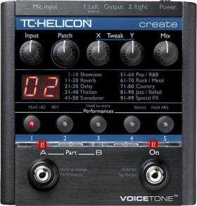 TC-Helicon VoiceTone Create - педаль - вокальный процессор спецэффектов для "живой работы", включающий такие эффекты, как "голос из мегафона", "голос из телефона", дисторшн, реверберация, дилэй и др.