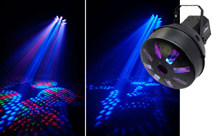 Простые центральные эффекты. Также как и у Flower effects управление цветом, направлением лучей и типом гобо происходит через внутренний микрофон, синхронизируясь с аудио. Автоматический режим в такт музыке по записанным в памяти прибора программам. Функция black-out (при наличии газоразрядной лампы).