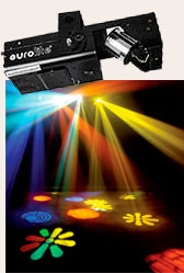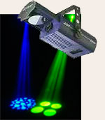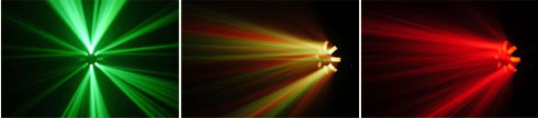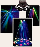 - основные эффекты – хаотическое вращение световых лучей, меняющих свои цвета и рисунки (при наличии дополнительных трафаретов). Движение лучей может осуществляться как само по себе, так и в такт музыки. Управляются специальными пультами управления светом или DMX контроллерами.