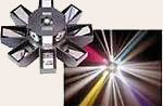 Beam Effects /Луч-эффекты – приборы, состоящие из множества различных цветных линз, расположенных вокруг центрального источника света и встроенных в сферические или полусферические приспособления, также известные как mushroom. Луч-эффекты могут иметь одну или несколько сфер, снабженных мотором и вращающихся вокруг лампы непрерывно, а могут менять направление вращения в