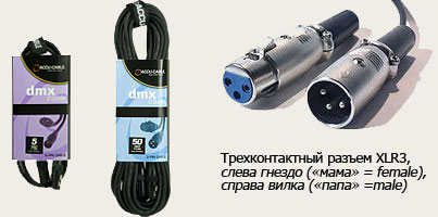 Выбранные вами световые приборы будут определять необходимые кабели для их подключения к системе. В общем, вам потребуется один шнур питания для каждого прибора, а также соответствующие удлинители (при необходимости). Кроме того, если вы подключаете приборы через DMX, вам потребуется один DMX кабель на каждое устройство. DMX кабели используют XLR разъемы, которые бывают 3-х или 5-ти контактными. Информацию о том, какие именно подходят для Ваших устройств, можно найти в Руководстве пользователя приборов и контроллеров.