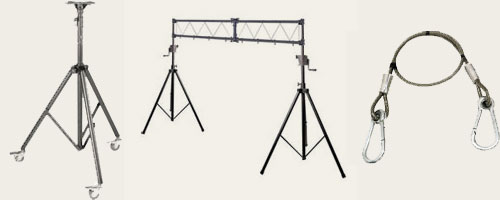 В дополнение к световым приборам и кабелям, вы должны приобрести либо штатив (треногу), либо стропила. Поднять световые приборы над полом необходимо по двум причинам: чтобы увеличить радиус действия устройств и чтобы предотвратить их повреждение при вибрации и случайном контакте. При подвешивании любого осветительного прибора обычно используют страховочный трос.
