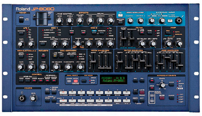 Roland JP-8080 - звуковой модуль, использующий физическое моделирование для имитации аналоговых инструментов, сделанный на основе синтезатора JP-8000, но имеющий по сравнению с ним дополнительные возможности. В частности, полифония увеличена до 10 голосов, возможно воспроизведение двух тембров одновременно, добавлен одноголосный режим Unison, появились инструментальный и микрофонный входы. За счет этих входов можно не только обрабатывать внешний сигнал синтезаторными возможностями модуля, но и использовать голос для управления этой обработкой (функция Voice Modulator, имеющая три режима: Formant Filter, Filter Bank и Vocal Morph Control). При включении функции Voice Modulator полифония сокращается до восьми голосов.