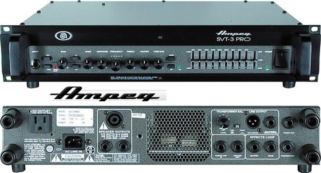 AMPEG SVT-3 PRO - один из бестселлеров компании Ampeg - он дает огромную мощность! С 450 Ваттами и гармоничным звучанием электронных ламп, SVT-3PRO - лучший выбор рокеров и фанкмейстеров по всему миру. Усилитель для бас-гитары, SVT 3 PRO, компании AMPEG, имеет размер в две единицы рэкового пространства. Так-же, этот усилитель может легко устанавливаться, как "голова", для этого на нижней стороне конструкции предусмотрены четыре, резиновые ножки, для большей устойчивости на любой поверхности. Конструкция очень прочная и надежная, изготовлена из металлического сплава с черным покрытием, на передней панеле удобно расположены ручки управления усилителем и ползунки управления, что позволяет музыкантам с легкостью производить настройки в процессе работы. Охлаждение от перегрева системы усилителя принудительное, посредством встроенного вентилятора. Что бы повысить надежность аппарата и увеличить защиту акустических систем во время переходных процессов, которые возникают при включении усилителя, предусмотрена релейная защита.
