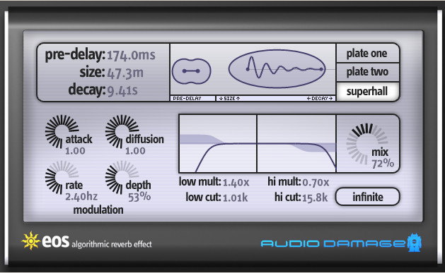 Так же, как и все продукты от Audio Damage, Eos предоставляет отличное отношение цена/качество. Основанному на двух алгоритмах (два plate и Superhall), этому плагину нет равных в симуляции огромных пространств и насыщении скучных миксов. Интерфейс плагина предельно понятен и имеет небольшое количество параметров, так что не отпугнёт начинающих звукорежиссёров. Отличное предложение за небольшую цену, даже при сравнении с другими разработками своего создателя, основавшего ValhallaDSP.