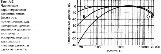 Например, в технических требованиях к отношению сигнал/шум предварительных усилителей может быть указано значение "85 дБ, со взвешивающим фильтром А". Это значит, что шум был пропущен через фильтр с амплитудно-частотной характеристикой, соответствующей кривой А рис. А-7 до того, как было произведено измерение шума предварительного усилителя. Следовательно, применение взвешивающих фильтров делает измеренное отношение сигнал/шум более высоким. Точно так же применение взвешивающих фильтров для измерения уровня звукового давления дает измеренное значение SPL ниже, чем физическая сила звука.