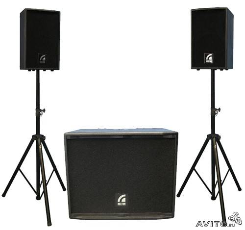 В комплект входят две акустические системы с динамиками 10" и драйвером 1", активный субвуфер с динамиком 15" и стойки под акустические системы.