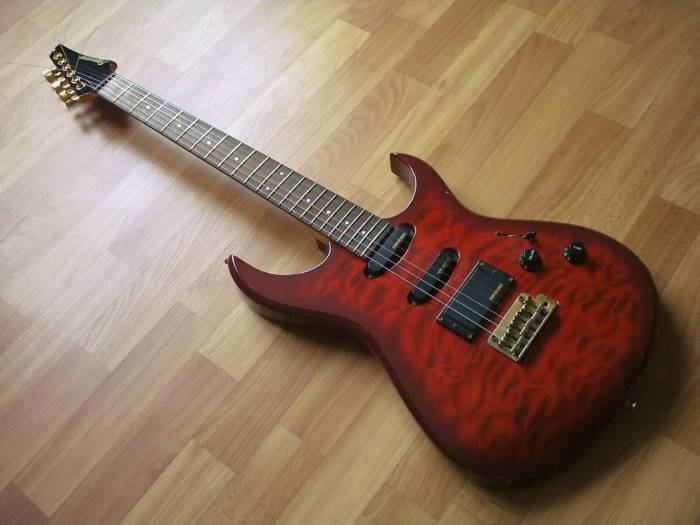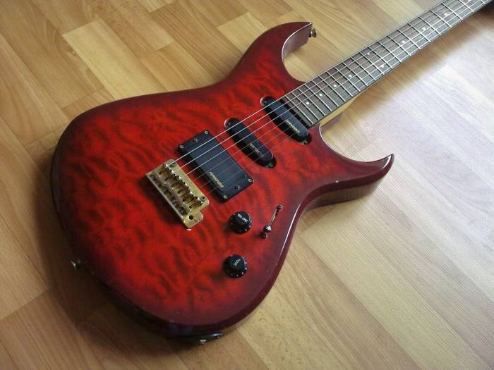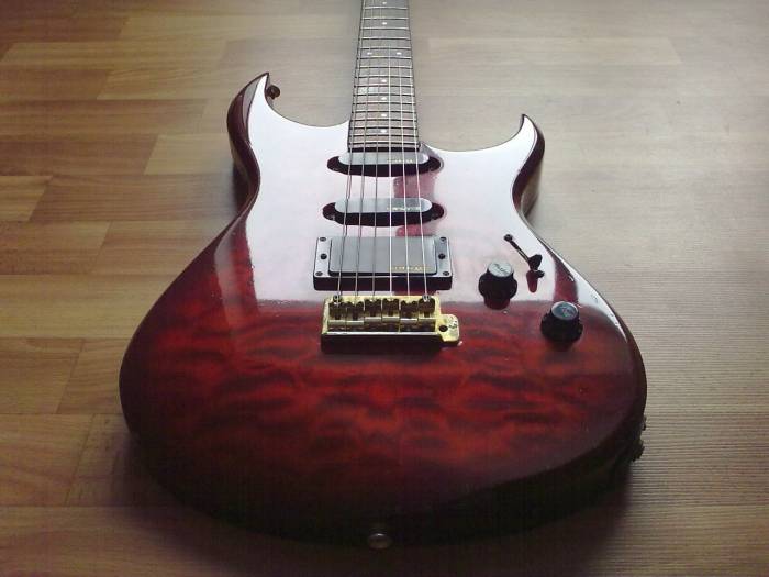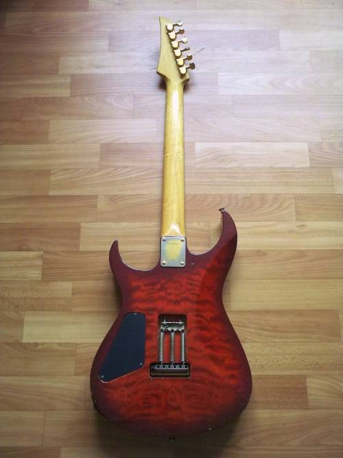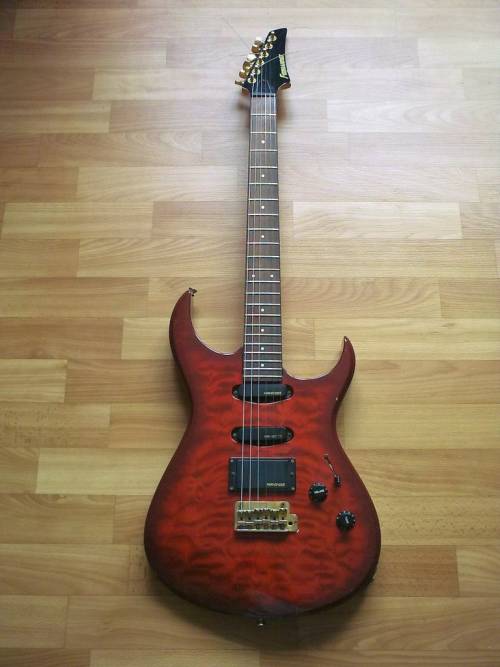 Особенно красивый экземпляр в редко встречающейся красной расцветке с красивейшим топом из огненного клена. Гитара с очень удобным скоростным грифом приятно лежащим в руках, обладает прекрасным резонансом, звук яркий и сочный как на чистом, так и на перегрузе, звонко звучит даже неподключенная в усилитель.