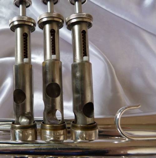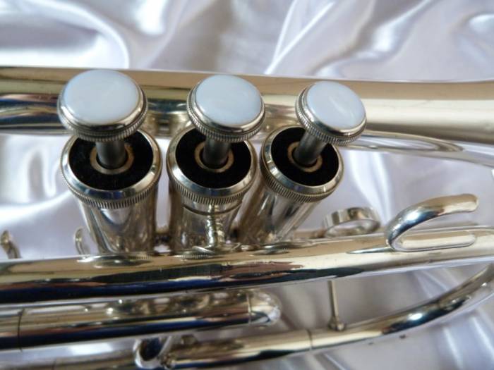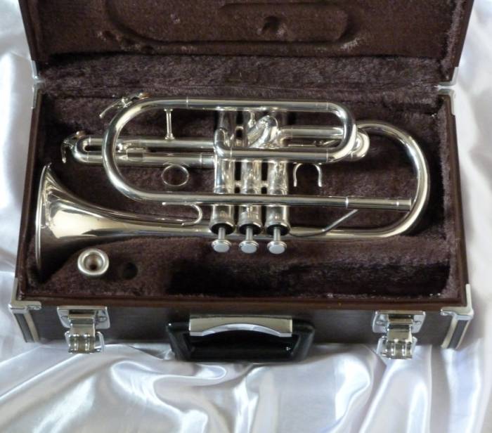 производство Япония, студенческая модель, покрытие серебро. Помпы работают отлично, инструмент в хорошем техническом состоянии, на корпусе есть мелкие потертости,царапины, вмятинки. В комплекте мундштук, жесткий футляр. Цена 15000 руб.