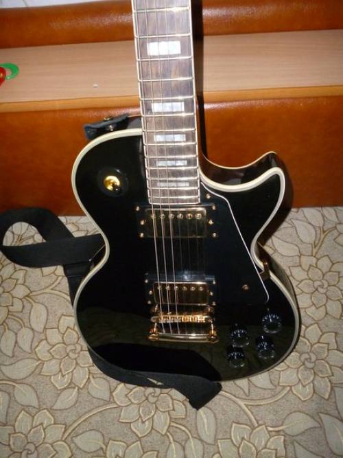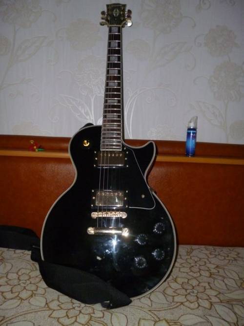 Гитара новая, 2014 года. Стоят струны Gibson Brite Wires 10-46. Экранировка фольгой. Звукосниматели H-H. Цвет фурнитуры золото, инкрустация перламутровые прямоугольники. Гитара отстроена, в рабочем состоянии, криф не толстый, удобно лежит в руке. Весит 4,7 кг. Гитара сравнивалась с американским Gibson LP Standard на лампе Marshall. Звук очень близок к оригиналу, не хватает той самой глухости.