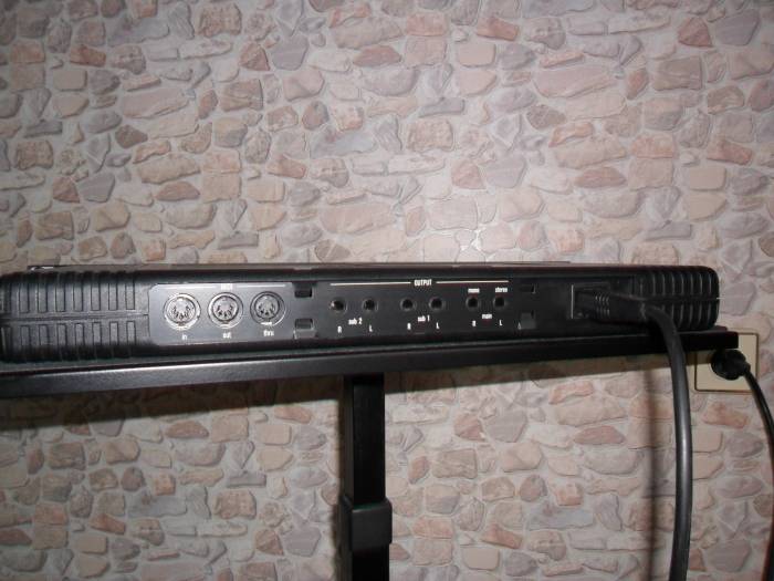 3 аналоговых стереовыхода, midi in, midi out, midi thru.