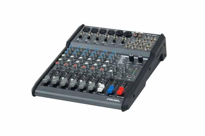 Proel M8 микшерный пульт 6 моно (комбо разъемы XLR/Jack), 1 стерео вход (разъемы jack) фантомное питание + 48V , выходные разъемы (XLR/Jack), 3-х полосные эквалайзеры на стерео входы, 3-х полосный эквалайзер+НЧ фильтр на микрофонный вход, блок эффектов, 256 пресетов. В комплект входит сумка, рековые крепления. Вес 3,1кг.