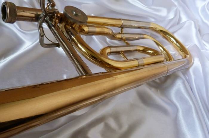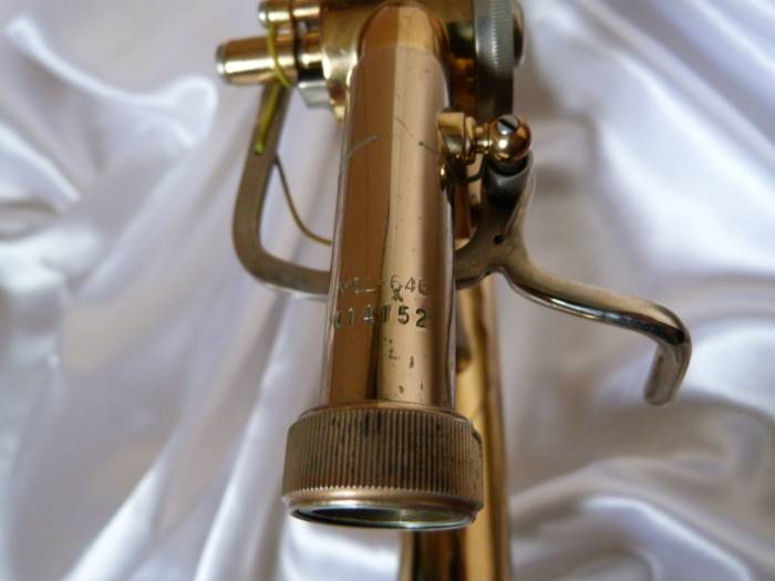 Инструмент в хорошем состоянии, техническое обслуживание проведено,есть потемнения и потертости лака на корпусе. В комплекте мундштук и чехол АМС (новый)