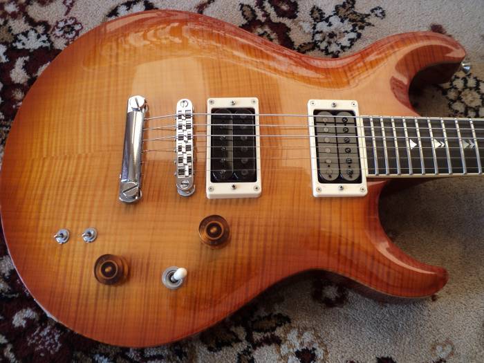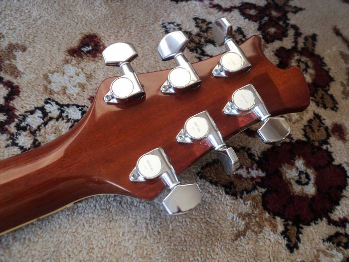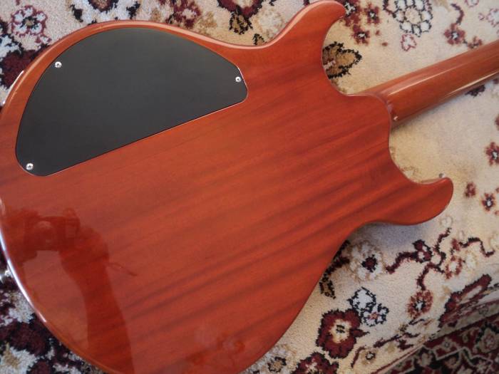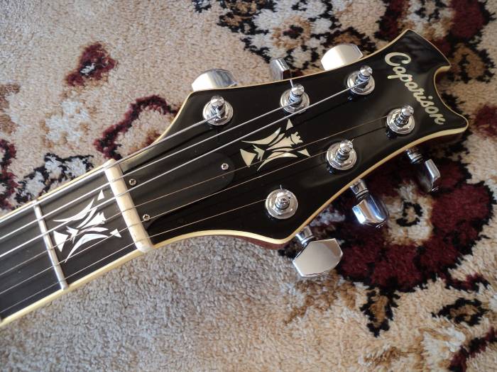 Великолепный и очень редкий инструмент из первого периода производства компании, когда все делалось вручную и мелкими сериями. 24 ладовый Angelus с разметками ладов в виде кельтских узоров,сделанных из натурального перламутра(не акрил).Множество вариантов звучания из за возможности переключения хамбакеров в сингловый и противофазный режимы, а сам инструмент даже неподключенным выдает роскошный рояльный звук с хорошим сустейном и ровным затуханием нот.