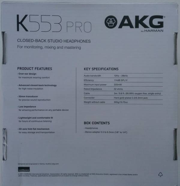 AKG K553 Pro имеют 50-мм излучатели, в результате чего пользователь получает мощный и точный бас. Амбушюры с эффектом памяти можно заменять, они покрыты кожей и не доставят дискомфорта даже при долгом прослушивании музыки. Наушники отличаются низким импедансом, что позволяет использовать их с устройствами с невысоким уровнем выходного сигнала.