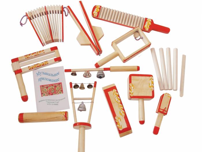 Набор шумовых музыкальных инструментов, выполнен из дерева, расписан оригинальным узором, покрыт лаком. Состоит из 12 музыкальных инструментов и музыкального приложения.