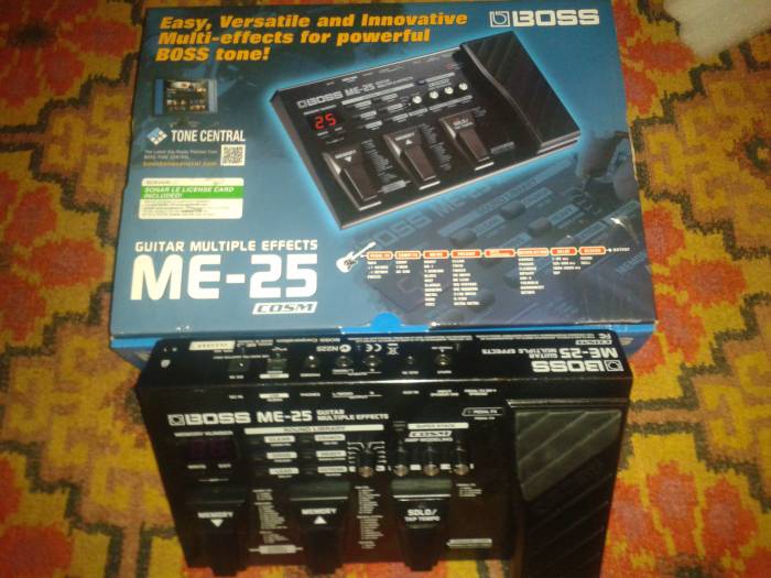 В процессоре Boss ME-25 имеется встроенный фразовый сэмплер, позволяющий записывать, а затем воспроизводить до 38 секунд звучания. Оцифровка гитарного сигнала осуществляется с разрядностью 24 бит и частотой дискретизации 44,1 кГц. В памяти устройства хранится 60 пресетов и столько же звуков при этом дополнительные звуки можно совершенно бесплатно загружать с сайта производителя. К компьютеру гитарный процессор Boss ME-25 подсоединяется посредством USB-интерфейса. При этом ME-25 может работать в качестве аудиоинтерфейса для этих целей в комплекте поставки имеется виртуальная студия Sonar. Также имеется дополнительный линейный вход AUX для подключения внешнего источника сигнала (например, CD- или mp3-плеера). Питание гитарного процессора ME-25 осуществляется либо от сети (9-вольтовый блок питания прилагается), либо от шести батареек типа AA. Потребляемая мощность - 150 мА. Габариты - 300 мм х 191 мм х 72 мм. Вес - 1,9 кг