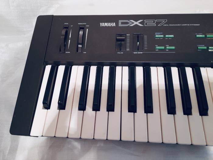 Yamaha DX27 — это полноклавишная версия Yamaha DX100, выпущенная в Японии в 1985г, которая, в свою очередь, представляет собой облегченную версию знаменитого синтезатора DX7, выпущенного в 1983 году, который известен своими четкими, яркими и стеклянными тонами, которые резко контрастировали с теплыми аналоговыми тонами той эпохи, созданный на основе технологии FM-синтеза, разработанной в Стэнфорде Джоном Чоунингом, DX7 стал революцией в технологии синтезаторов и принес в руки артистов мир звуков, не похожий ни на что из того, что было до него. DX27 предлагает уменьшенный корпус с портативным форм-фактором, уменьшенным количеством операторов и алгоритмов (4 и 8 соответственно по сравнению с 6 и 32 в DX7). и некоторые опции DX7 не включены в DX27 (например, арпеджиатор, фильтры). Но DX27 предлагает расширенную память патчей, и несмотря на более легкий корпус по сравнению с DX7, DX27 по-прежнему предлагает все тоже множество фантастических тонов, а также множество возможностей для настройки и создания новых звуков с помощью алгоритмического FM-программирования. Это отличный вариант для тех, кто хочет классический «стеклянный» FM-звук 80-х, которую можно легко взять с собой на концерт.