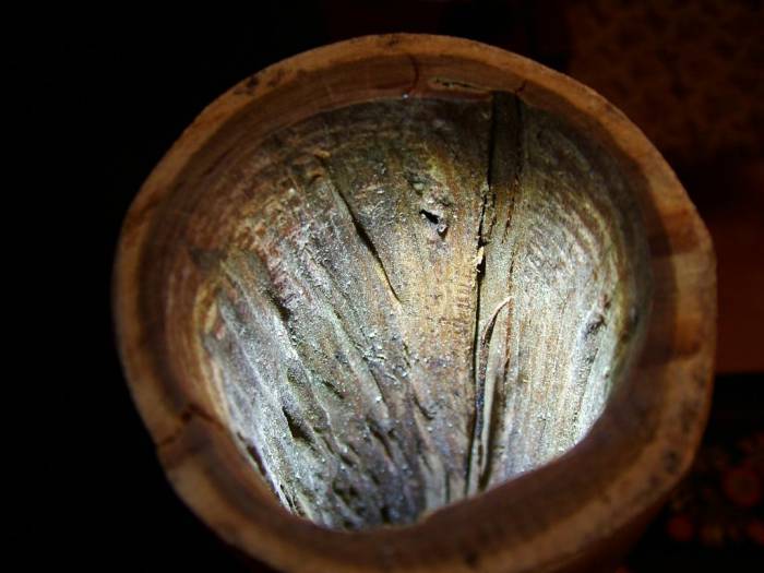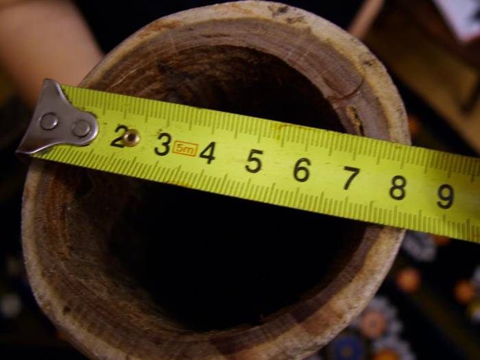 Натурально съедена термитами, сверху вручную обработана мастером - австралийским аборигеном. Минимальное вмешательство в природно-образованный инструмент. Древесина плотная и тяжелая, трещин нет (а т.к. рисунка нет - это легко проверить). Очень глубокий и мощный звук, превосходное обратное давление.