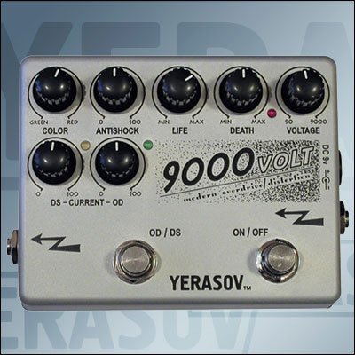 9000 Volt представляет из себя овердрайв /дисторшн-эффект, имитирующий звучание усилителей Marshall JCM800 / JCM2000 через стек 4х12 и являющийся модернизацией эффекта Jackhammer фирмы Marshall. Плотное и мощное звучание педали отлично подходит для различных стилей музыки, особенно для экстремальных направлений. Овердрайв и дисторшн имеют раздельные регулировки выходного уровня (CURRENT OD и CURRENT DS) и могут переключаться в процессе игры с помощью ножного переключателя OD/DS. Также имеется общая для двух эффектов ручка VOLTAGE (уровень искажения сигнала) и трехполосный эквалайзер с параметрической серединой DEATH (уровень высоких частот), LIFE (уровень низких частот), ANTISHOCK (уровень выреза средних частот), COLOR(выбор вырезаемых частот). Педаль выполнена в литом силуминовом корпусе, имеет “холодный” by-pass и трехцветную индикацию режимов работы.