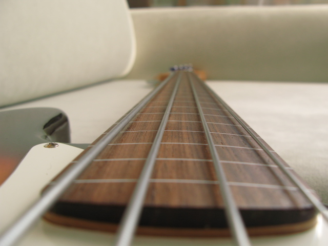 Мекс безлад 2003г. Корпус- ольха 1 кусок. Состояние на 5, накладка в идеале. Разметка сбоку точками. Играть очень удобно, струны низко. Датчики сеймур дункан- фона почти нет. Костяной порожек. Анкерный ключик.