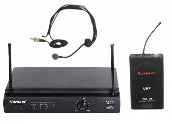 Двухантенная, высокочастотная радиомикрофонная система с передатчиком и головным микрофоном.