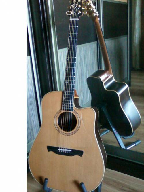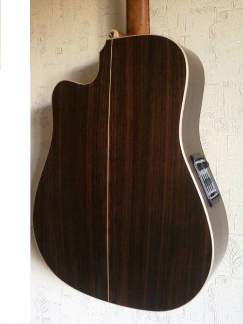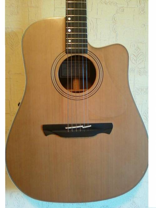 Великолепное творение испанских мастеров, гитара выполненная из массива (TOP Solid Red Cedar or Solid German Spruce; SIDES & BACK Solid Indian Rosewood ), с металлическими струнами (вестерн), с вырезом (cut away) для игры в верхнем регистре, тембр-блок Fishman со встроенным тюнером, микрофон+пъеза, подавлением обратной связи, эквалайзером (bass, treble, +параметрика), переключением фазы. Уникальный инструмент для фирмы Alhambra, которая в основном производит гитары на нейлоне. Цельный корпус (Верхняя и нижняя деки, обечайки). Отличается мягким звучанием, за что и была куплена