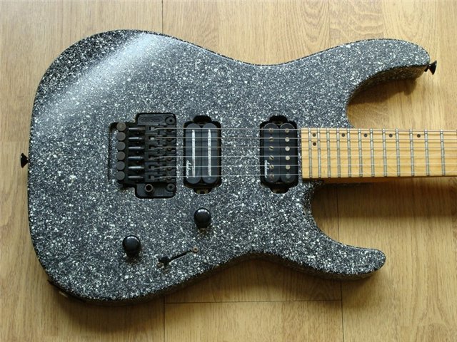 Данный инструмент - Динки с реверсной головой, в очень редком варианте раскраски и не менее редкой кленовой накладкой грифа. Первое что хочется отметить - интересный "гранитный" цвет - на ощупь он шероховатый, рука по нему не скользит. В отличие от ЕСП Эклипс старой серии, где была подобная окраска, но с вкраплениями блестящей мишуры, эта гитара не смотрится гламурно и глуповато, но сдержанно, немного олдскульно - в данном случае это скорее комплимент)