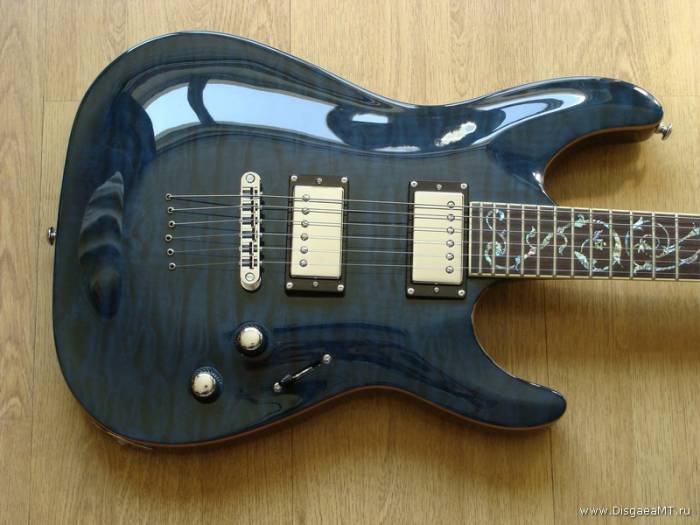 Инструмент типично для Шектера собран на идеальном уровне - ни малейшего криминала как по внешнему/косметическому состоянию, так и по техническому - отстроен и пребывает в состоянии, пригодным для игры без какого-либо вмешательства - что опять же присутствует даже на самых бюджетных инструментах, и тем более на серии Классик. Следует заметить, что гитара весьма красивая - хорошего качества клен на корпусе, инкрустация во весь гриф - причем выполненная безукоризненно (а операция весьма трудоемкая). В отличие от Голливуда, клен на корпусе выполнен не топом, а шпоном - очень маленькой толщины, потому на звук не влияет, но придает гитаре дополнительные баллы в номинации "внешнй вид".