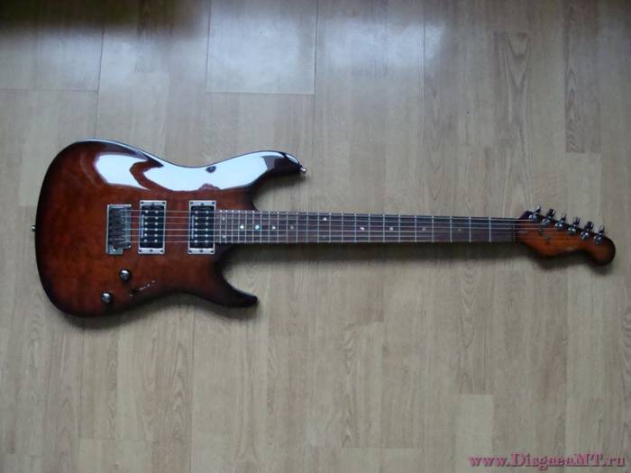 Инструмент изготовлен целиком из красного дерева, гриф вклеен, причем сквозь полупрозрачный лак видно весьма неплохую выборку махагона.