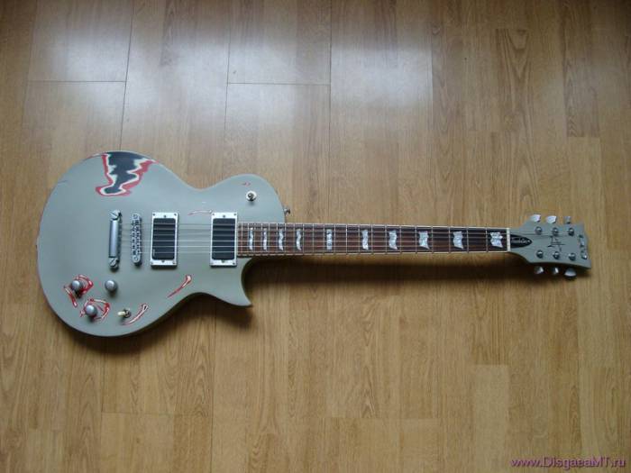 По сути - леспол с добавлением мелких фишечек согласно пожеланиям заказчика. По комплектации гитара аналогична большинству старых LTD EC-1000 - махагоновый корпус, вклеенный махагоновый гриф, датчики EMG 81-60, локовый бридж TonePros, локовые колки Sperzel. Помимо дизайна и занятной распайки, отличие всего одно - на ЕС-1000 24 лада, здесь 22. Очень радует, что на фоне всеобщего удешевления даже топовых ЛТД, комплектация этой гитары не меняется - все так же на нее ставят колки Sperzel, что в настоящее время редкость для ЛТД - но на Тракстере эта фишка неизменная и очень полезная. Очень прикольный дизайн гитары - а-ля старые грузовики (отсюда и название) - кое-где потертый, кое-где виден грунт - эдакий боевой инструмент. Плюс такого покрытия очевиден - даже если вы поставите на ней коцку, ее будет очень сложно обнаружить