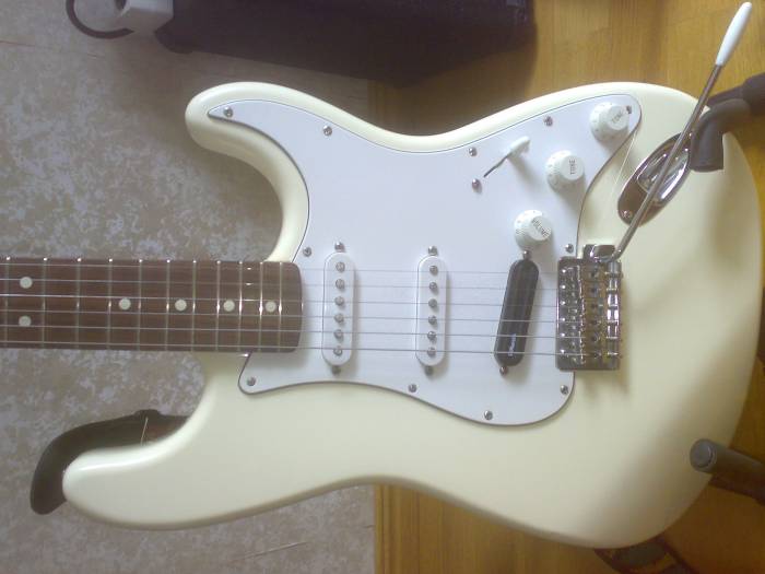 цвет белый с кремовым оттенком. Звукосниматель в бридже заменен на dimarzio fast track 2. стандартные колки заменены на локовые с регулируемой высотой gotoh. Инструмент в отличном состоянии