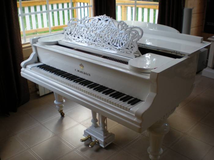 Продам отреставрированный белый кабинетный рояль Мюльбах (размеры 145х157см) с гарантией 2 года. Помогу с доставкой.