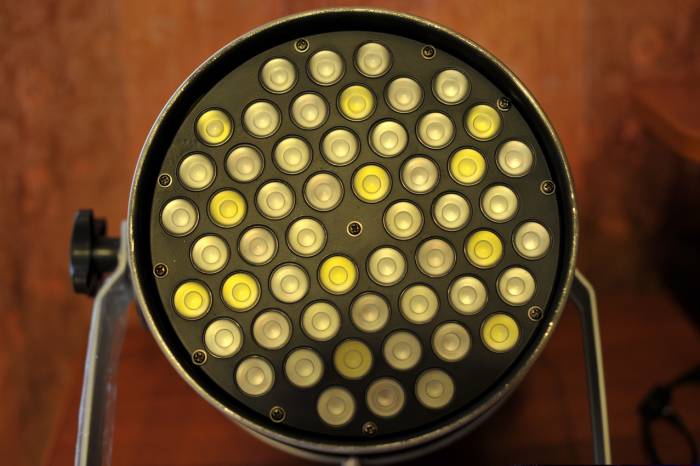 НОВЫЙ RGBW Светодиодный прожектор LED PAR-64 54x3w . В нем применена технология цветосмешения RGBW, это позволяет получить практически любой цвет. В приборе установлено 54 светодиодов мощностью 3W (14 красных, 14 зеленых, 14 синих, 12 белых). За счет применения специальных линз прибор обладает углом раскрытия луча 15 градусов. В сочетании с мощностью светодиодов прибор получил очень яркий узко направленый луч и может применяться на больших сценах, а также использоваться для создания лучевых эффектов. Благодаря применению светодиодов потребляемая мощность сведена к минимуму, а тепловыделение практически отсутствует. Кроме этого не требуется применение диммерных блоков и исключает лишнюю коммутацию. Имеется несколько режимов работы: по протоколу DMX-512, звуковой анимации, авто и режим Master/Slave.